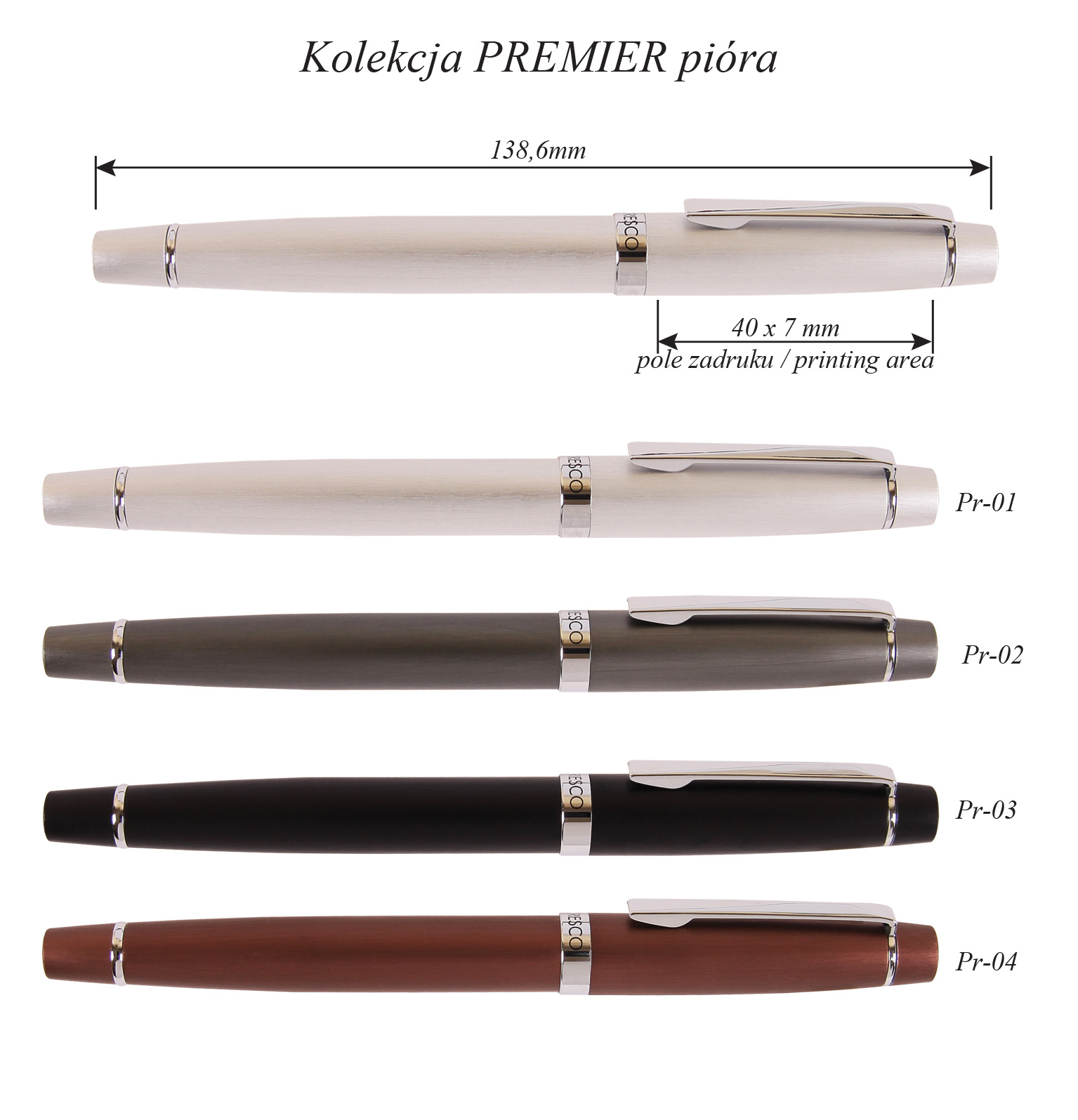 Ekskluzywne pióro metalowe PREMIER, to pióro którego nie będziesz musiał się wstydzić. Klasyczna i masywna konstrukcja. Pióro reklamowe doskonale nadają się do znakowania w eleganckich stonowanych kolorach. Zasilanie pióra za pomocą standardowych naboi atramentowych. Pióro zostało odpowiednio dociążone aby dobrze trzymało się w dłoni.